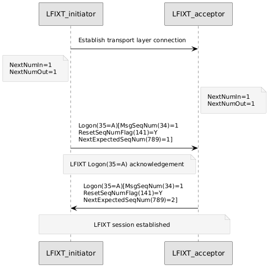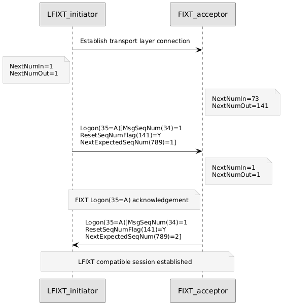 In the following example, an LFIXT initiator is establishing a new FIX connection to the FIXT session. This example shows how the FIXT acceptor resets its NextNumIn and NextNumOut values when the LFIXT initiator sends the Logon(35=A) request.