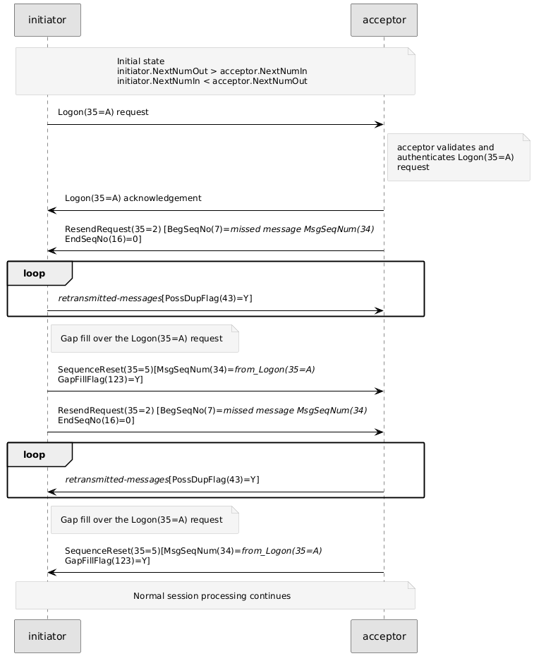 A FIXT initiator that is able to persist message history shall send a Logon(35=A) message with the following fields present. Upon receiving the Logon(35=A) request, an LFIXT acceptor shall adjust its own NextNumOut to the NextExpectedMsgSeqNum(789) contained in the Logon(35=A) request.