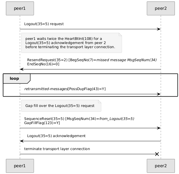 The amount of time expressed in seconds that a FIX session processor that has transmitted a Logout(35=5) request will wait for the Logout(35=5) acknowledgement before terminating the transport layer connection. This value may be specified out-of-band in a rules of engagement.